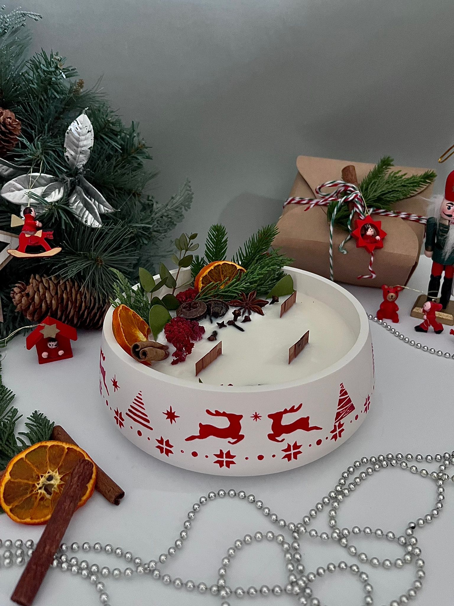 Vela navideña exclusiva y artesanal en un candelabro festivo, pintado a mano con esmero y atención al detalle. Cada elemento decorativo forma parte de la calidez y la magia de las fiestas invernales.
