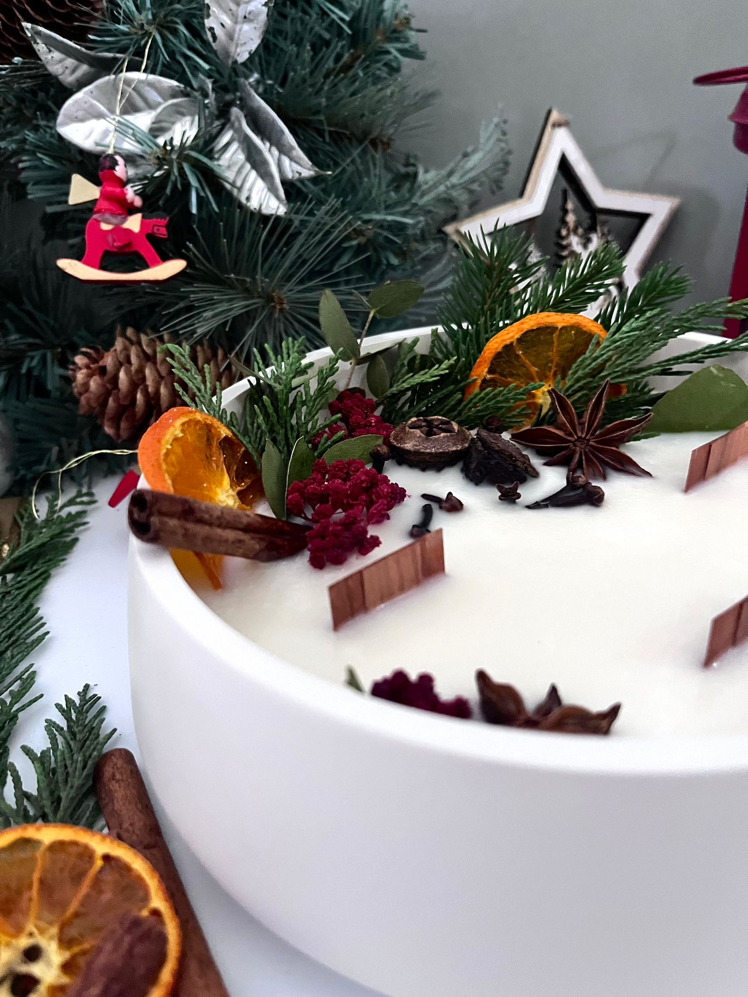 La vela está elaborada 100% con cera de soja, combinando estética, comodidad y aromas sofisticados que llenan el hogar del espíritu navideño.