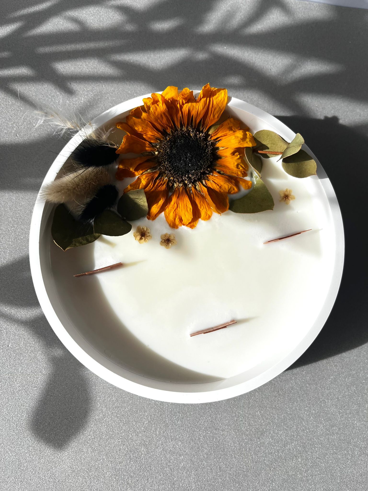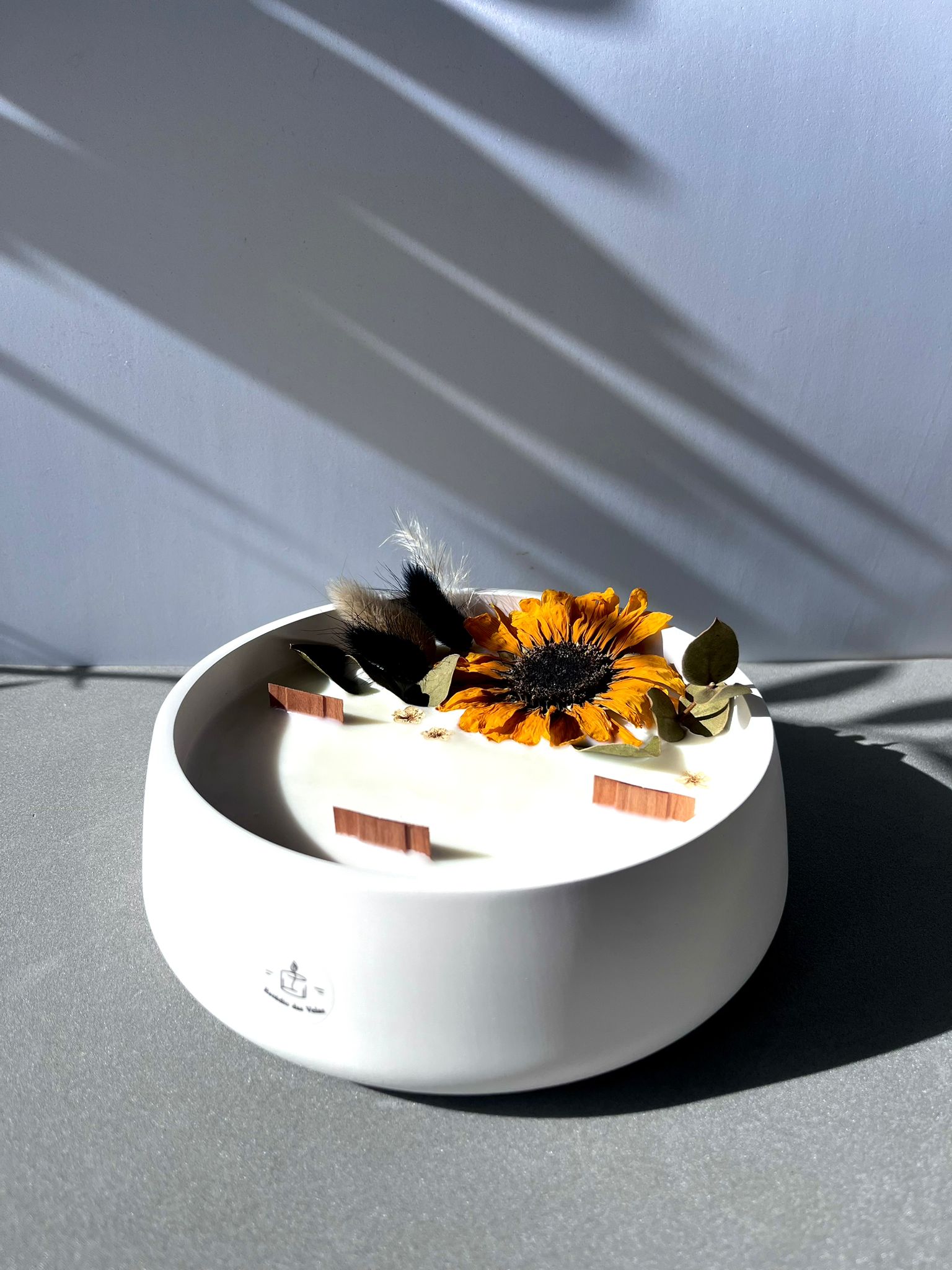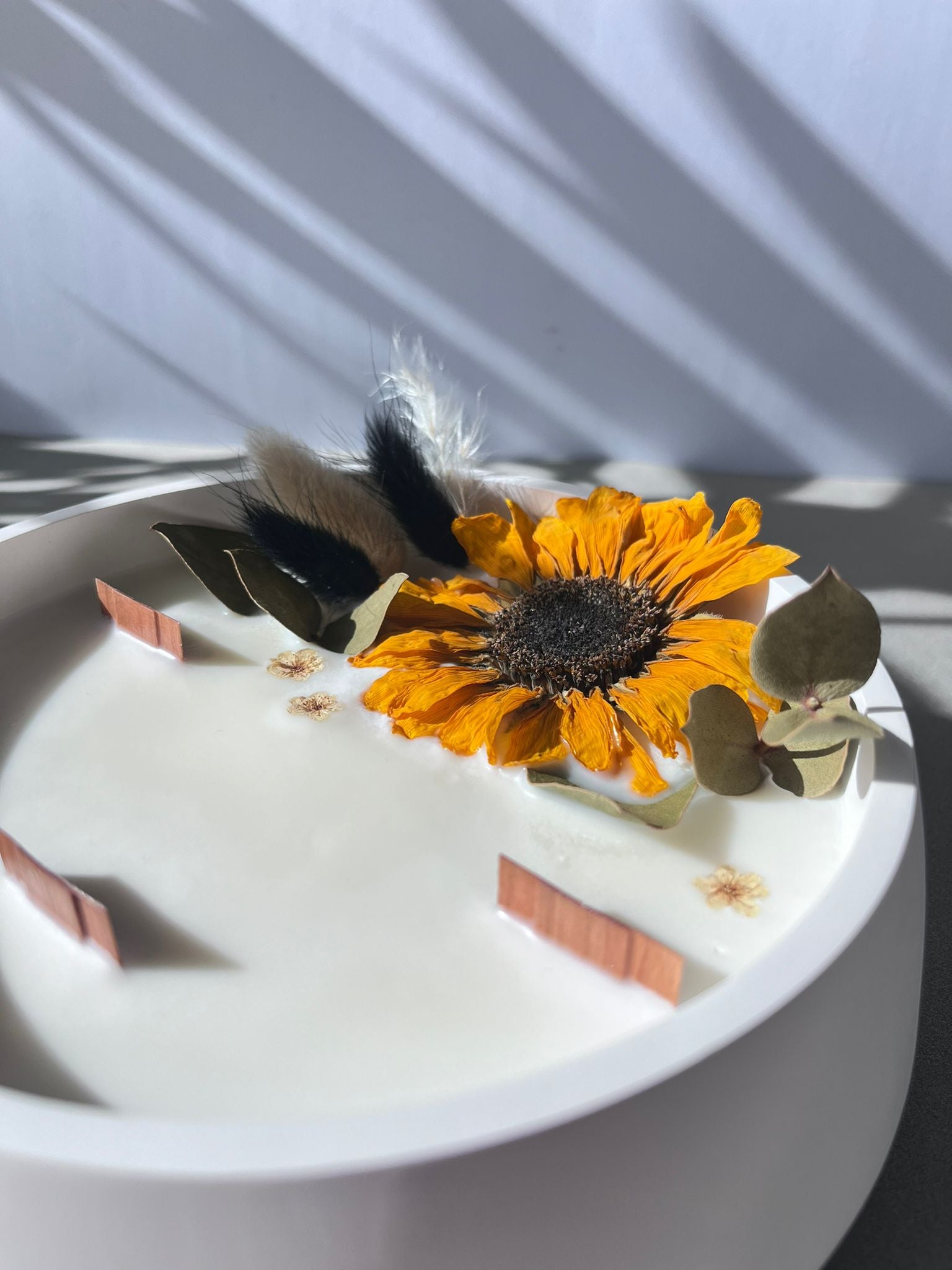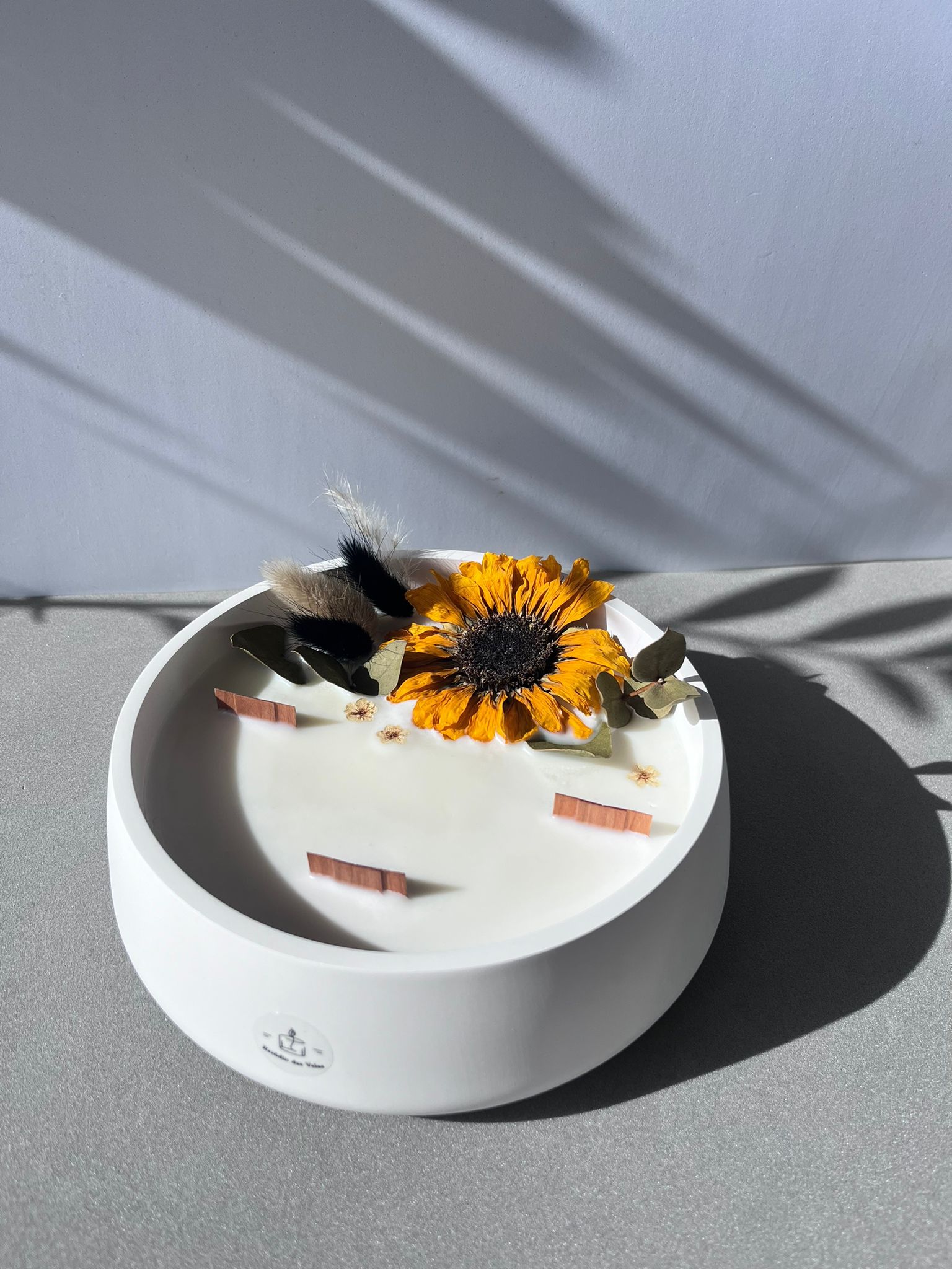 O destaque desta vela exclusiva é o girassol — símbolo de luz, calor e alegria de viver. Em harmonia com flores secas naturais em tons suaves e luminosos, ele forma uma composição delicada que transmite frescor, energia solar e a sensação de renovação da primavera. Cada peça é feita à mão, tornando cada vela única e irrepetível.