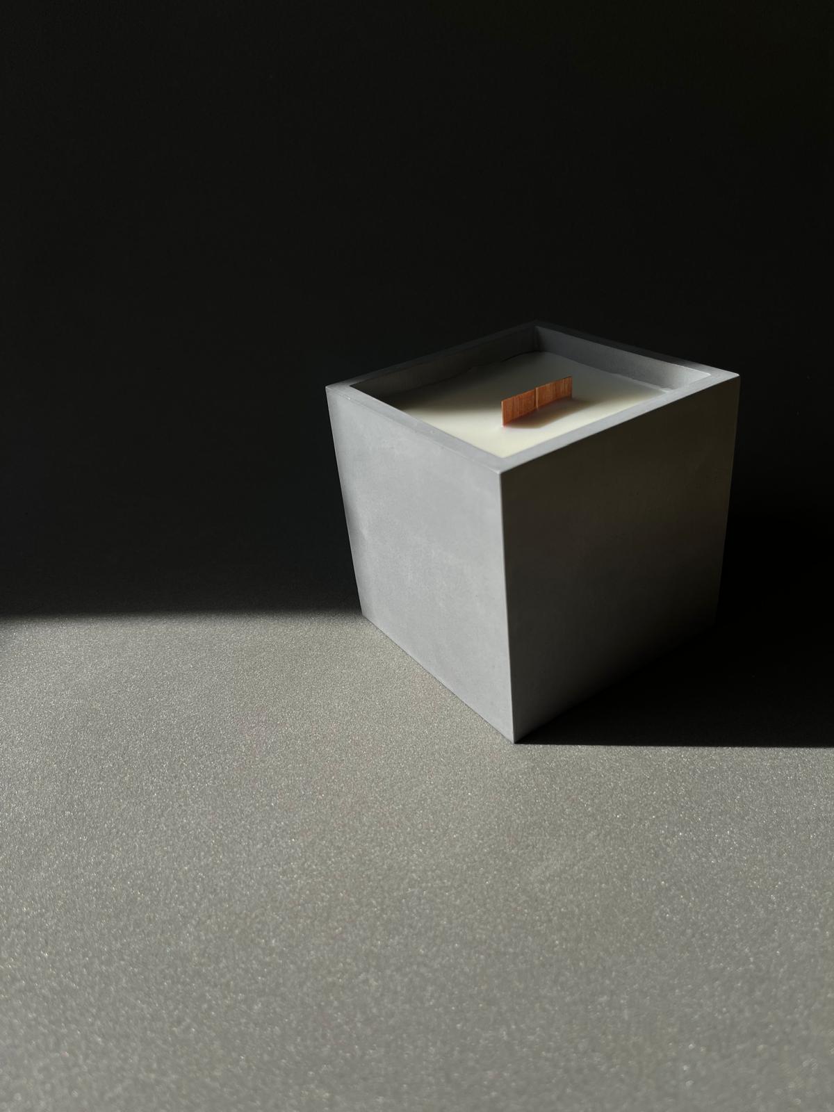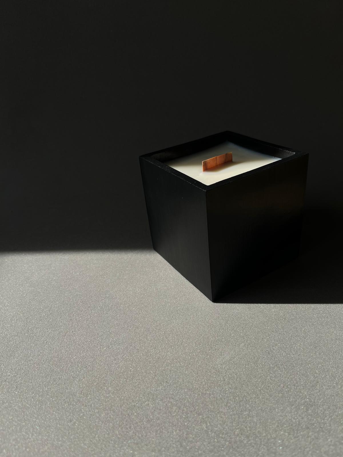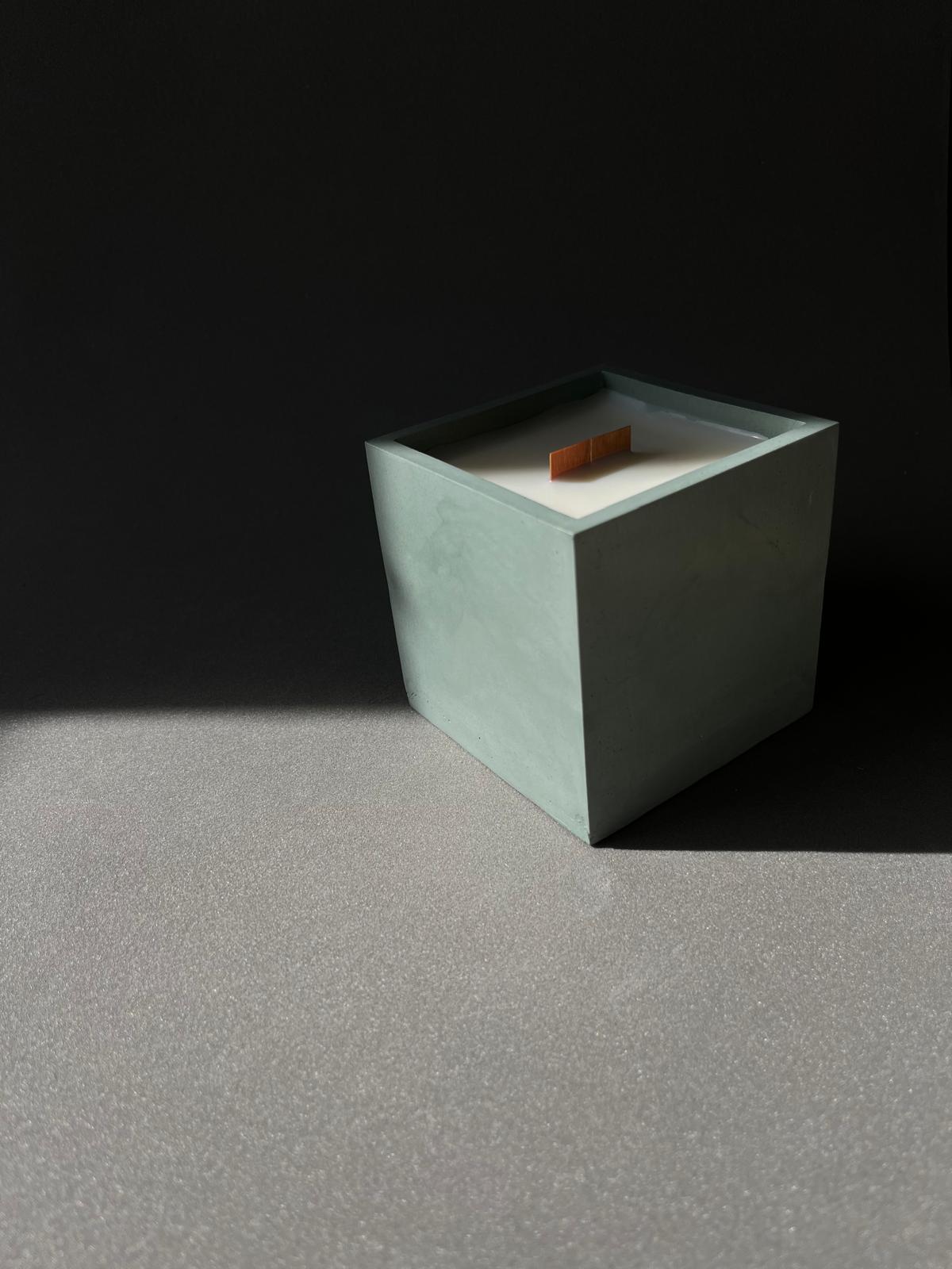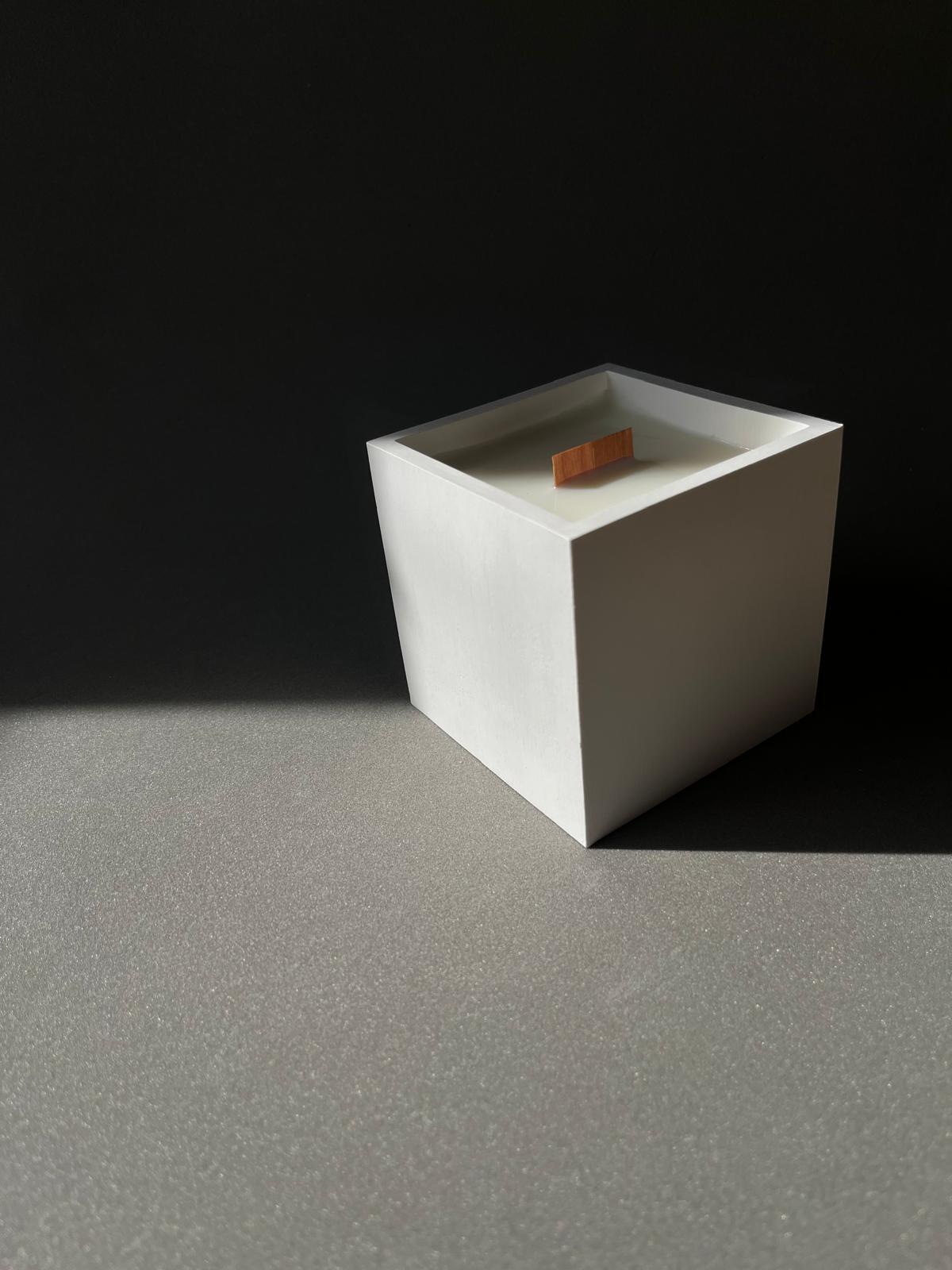 Vela perfumada artesanal em um elegante cachepô quadrado, também feito à mão em material de alta qualidade. Produzida com 100% cera de soja, une a força das formas geométricas, a sensação de harmonia e fragrâncias sofisticadas.