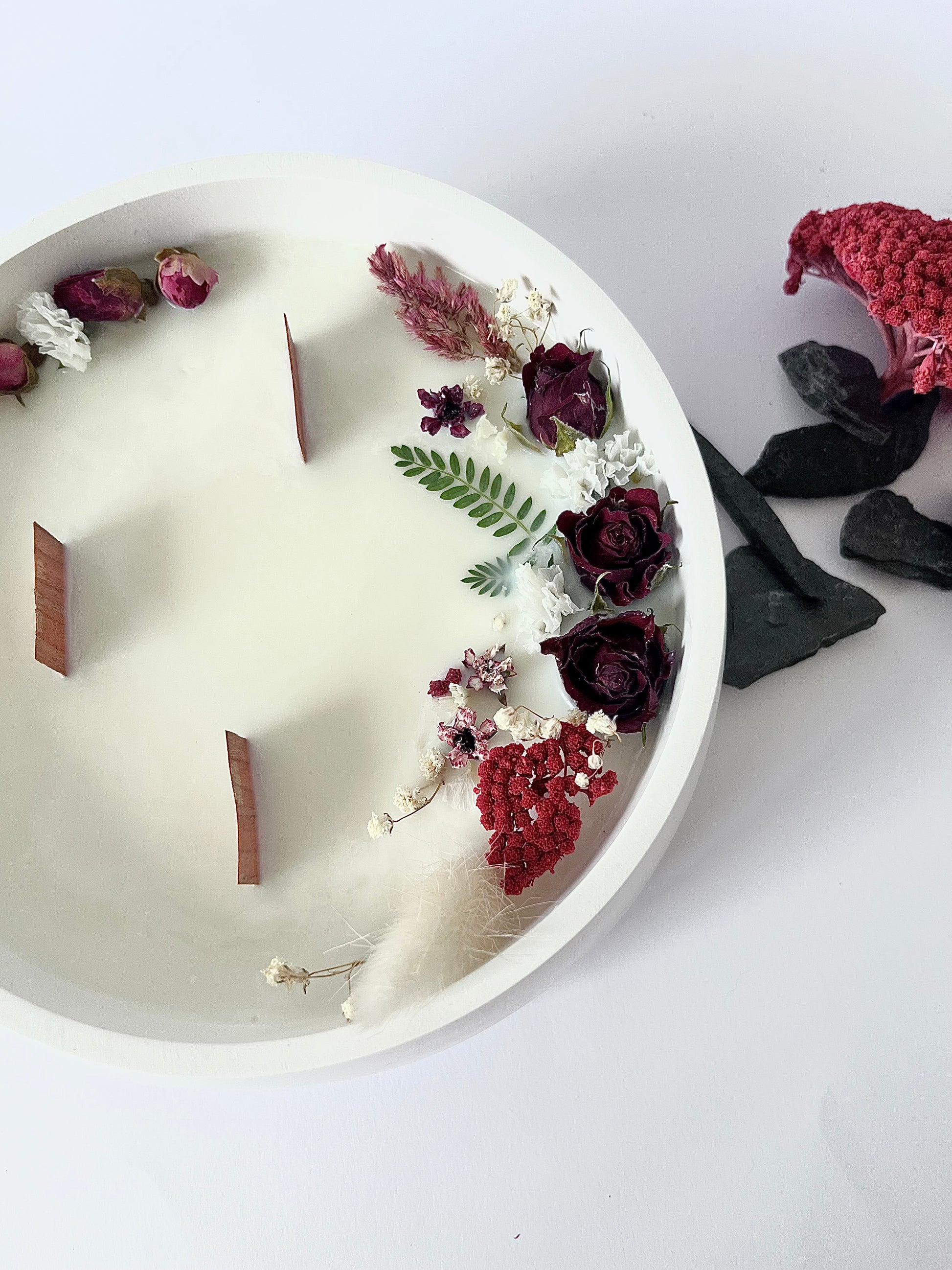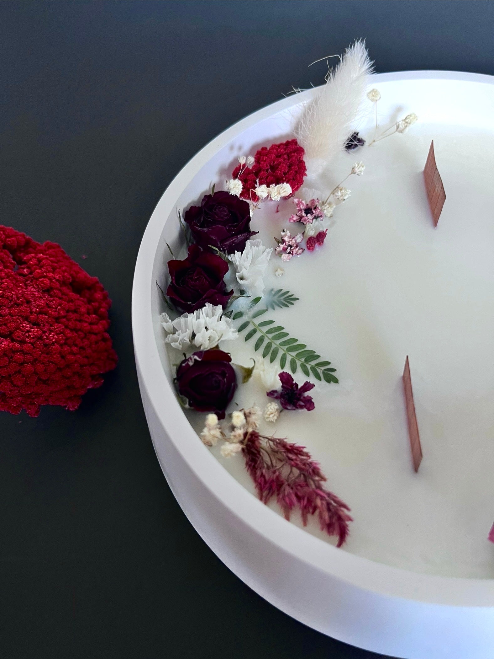 Vela perfumada feita à mão, decorada com flores secas, com destaque para rosas vermelhas no centro da composição, que acrescentam um toque extra de elegância e atmosfera.