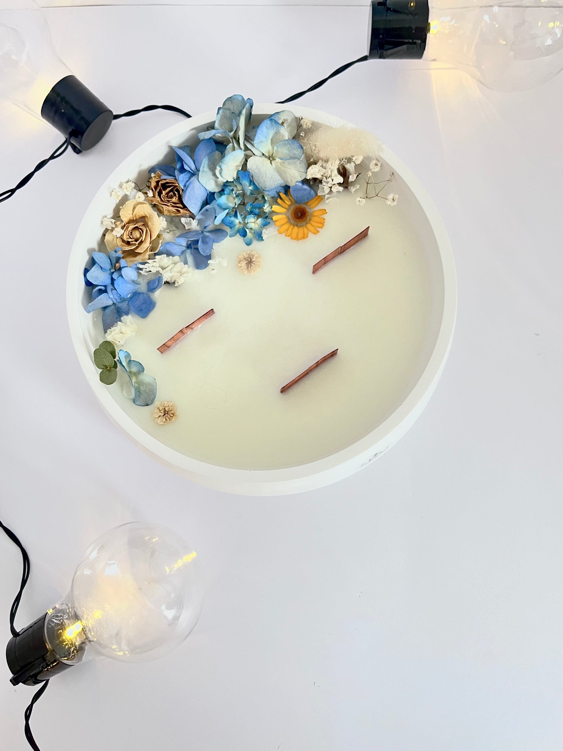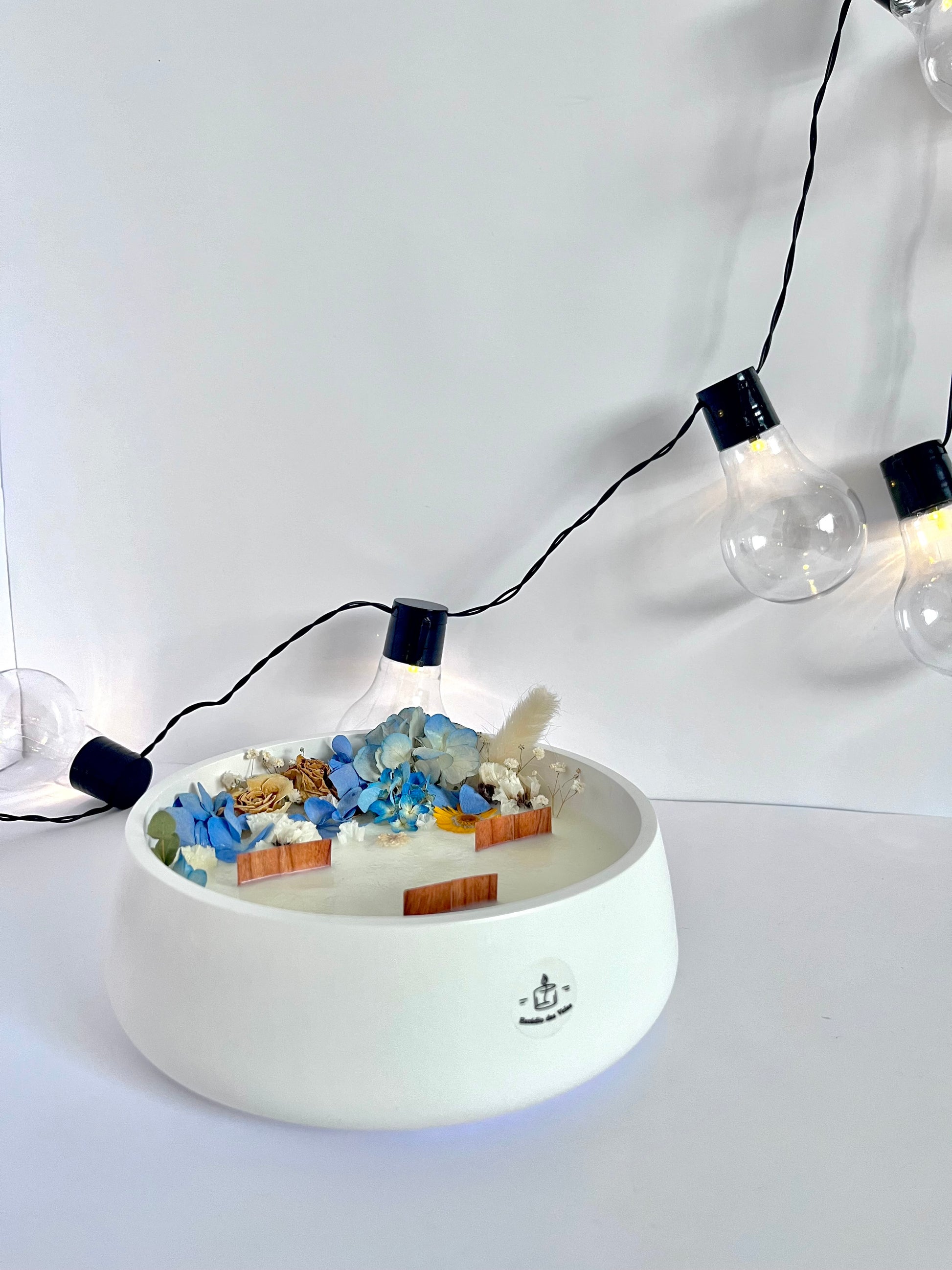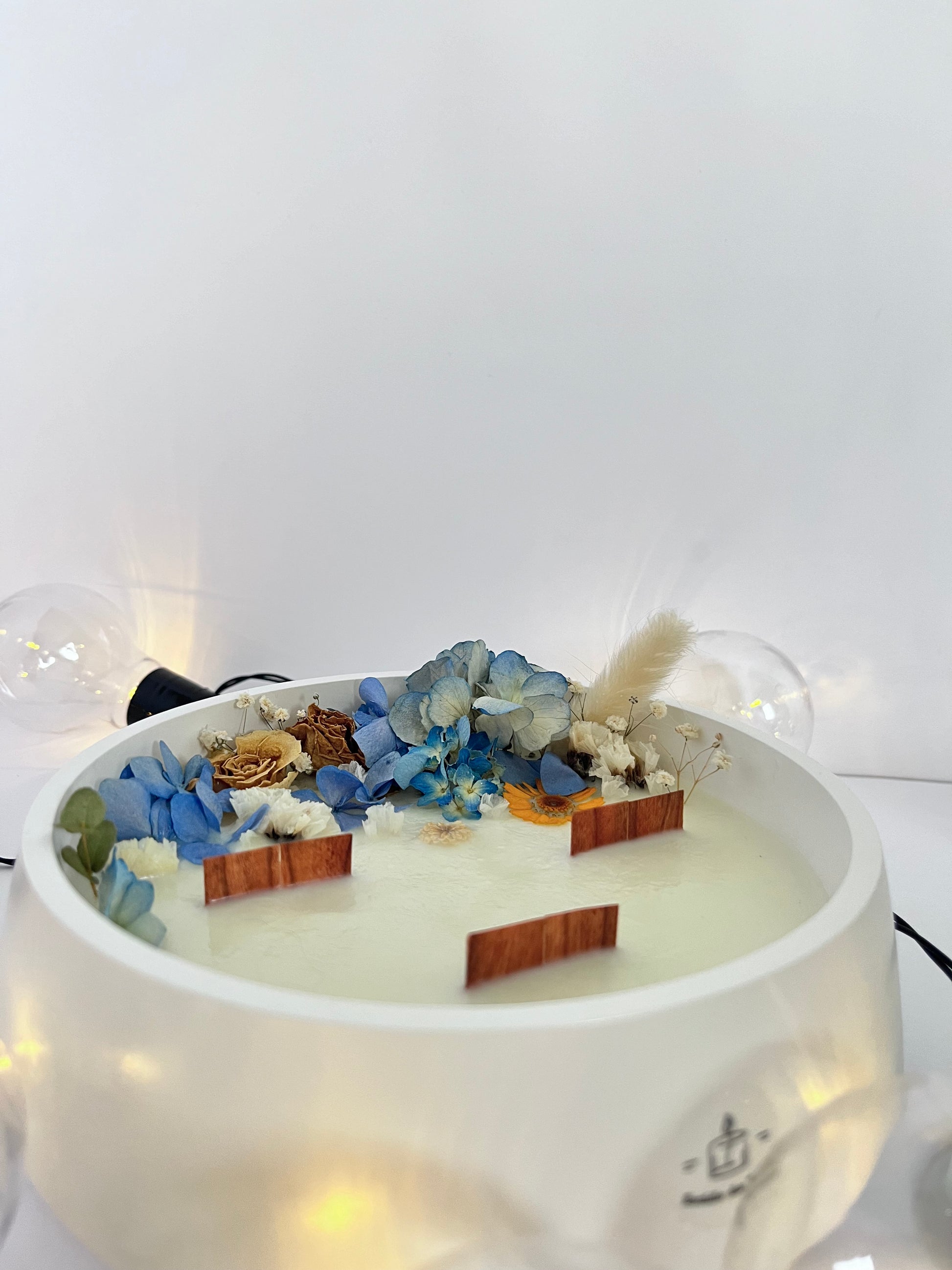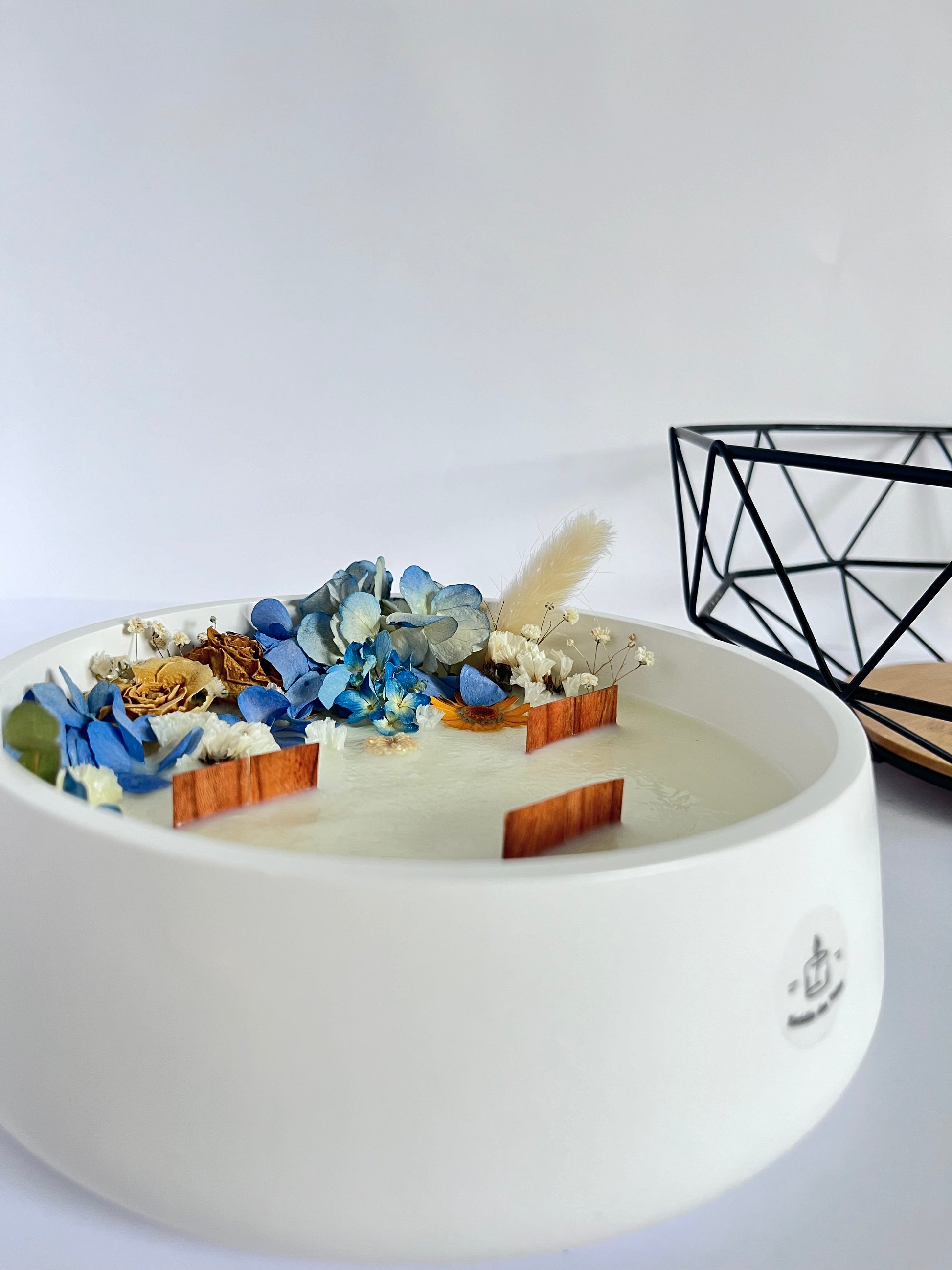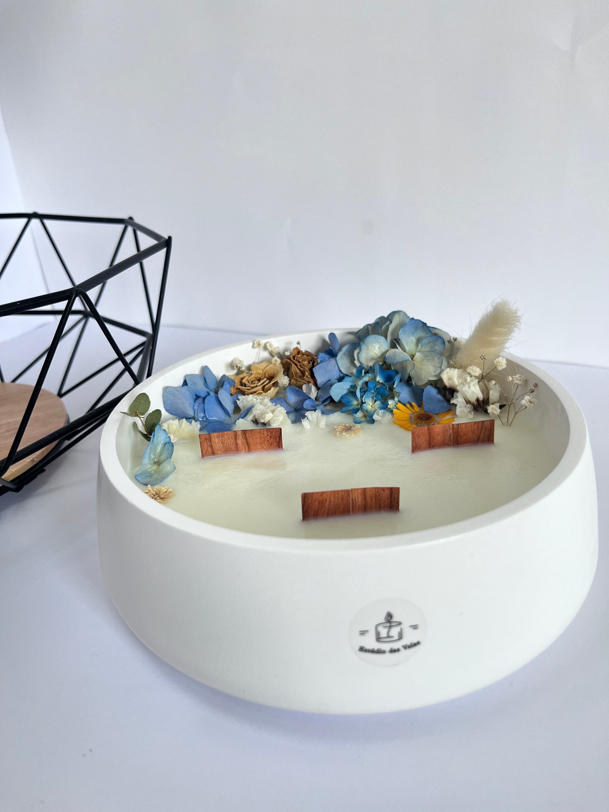 Vela perfumada feita à mão, decorada com flores secas, com destaque para hortênsias azuis como base do arranjo floral — um toque marcante que traduz a liberdade estética e a beleza não convencional do pós-modernismo. Um visual ousado, elegante e contemporâneo.