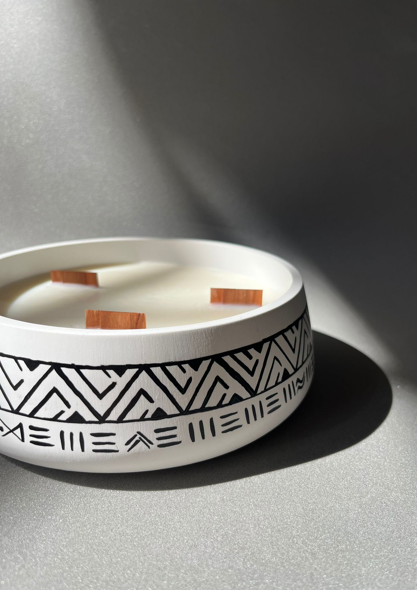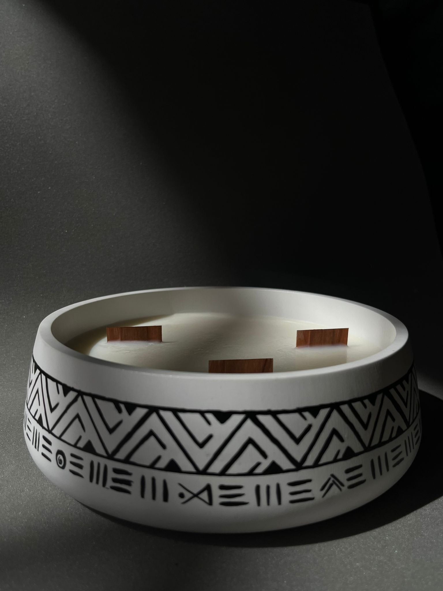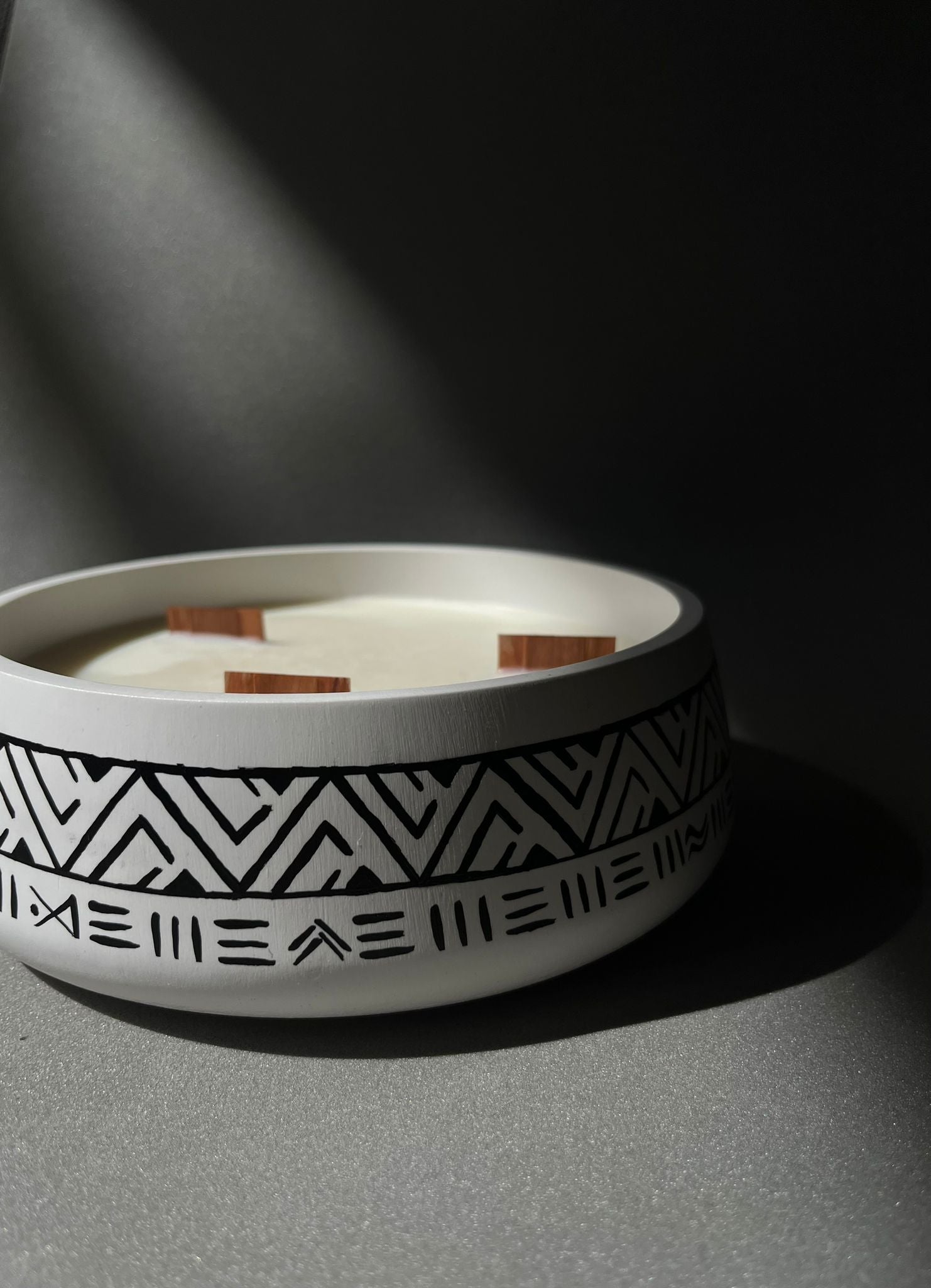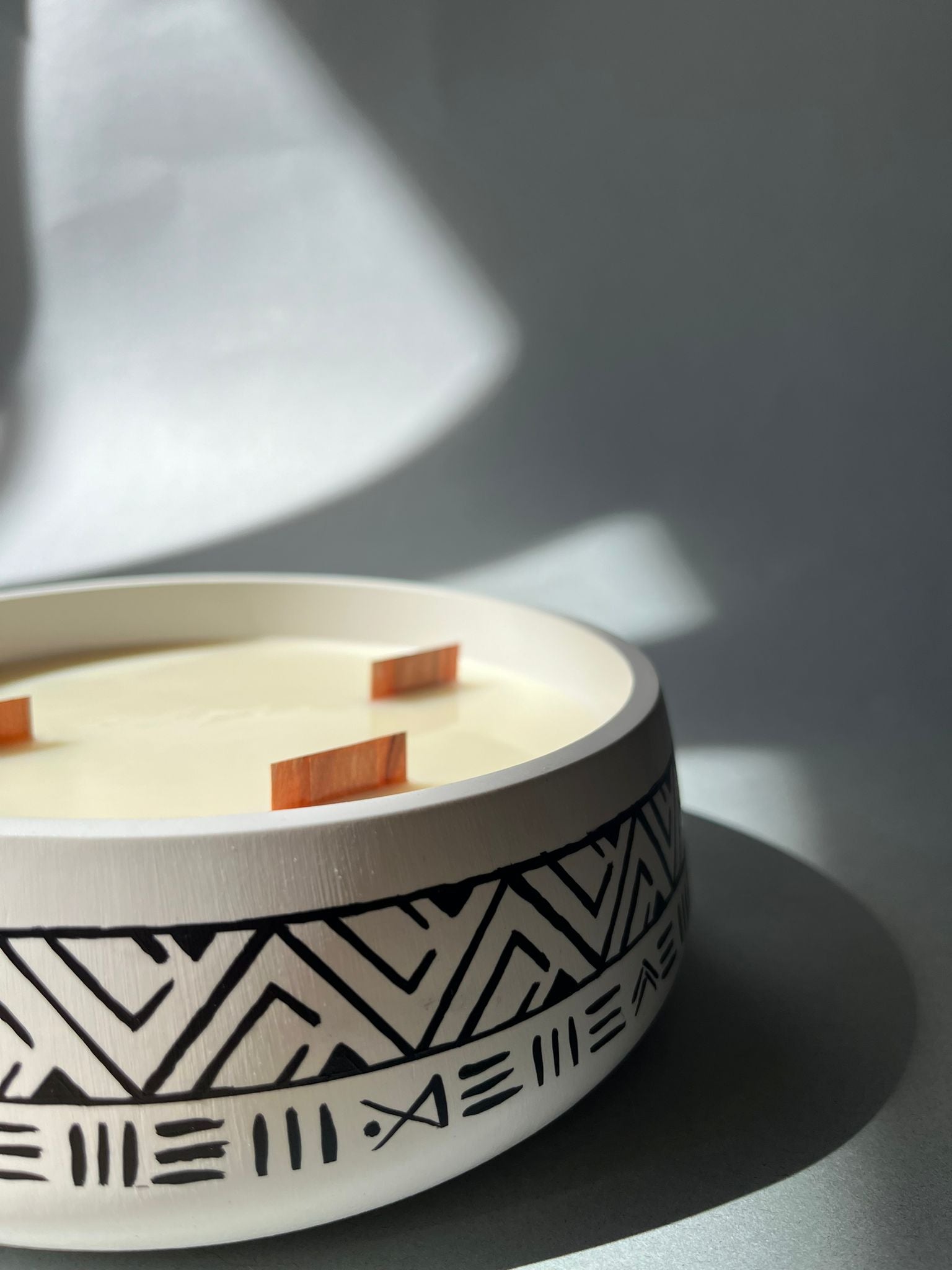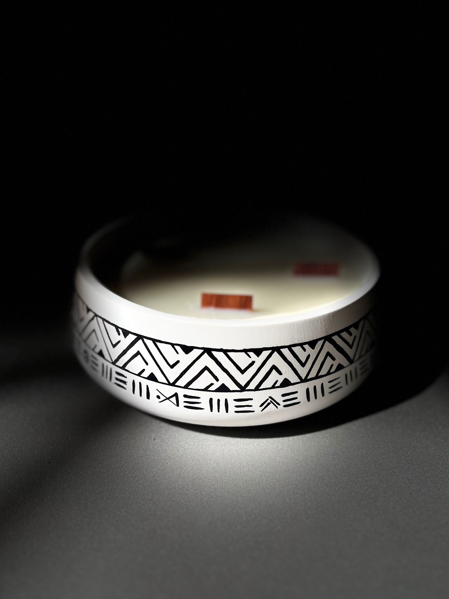 O grande diferencial desta vela está nos desenhos exclusivos, pintados à mão, elaborados com riqueza de detalhes. As linhas e símbolos geométricos transmitem a sensação de harmonia e infinitude, transformando cada peça em uma obra de arte única.