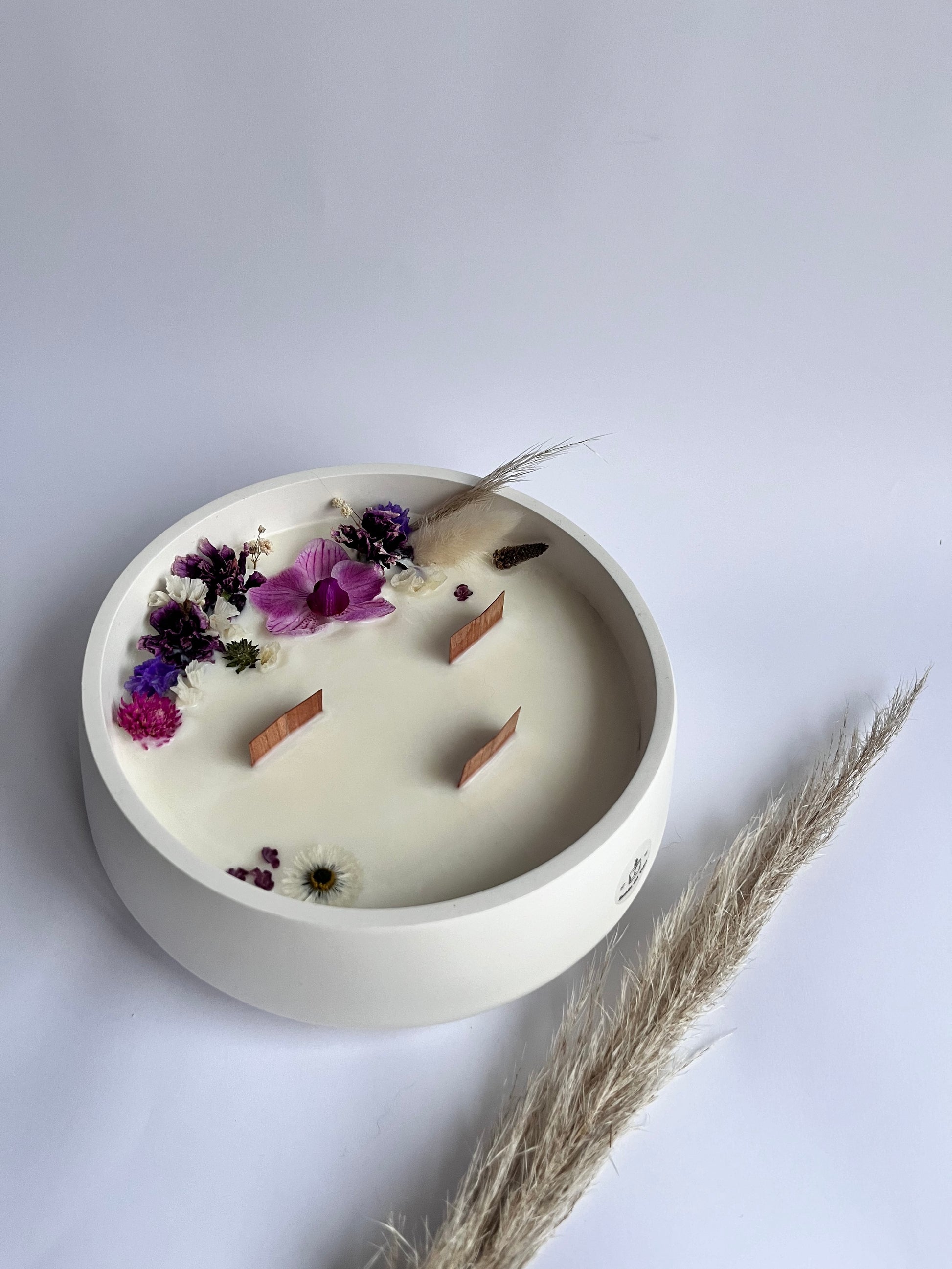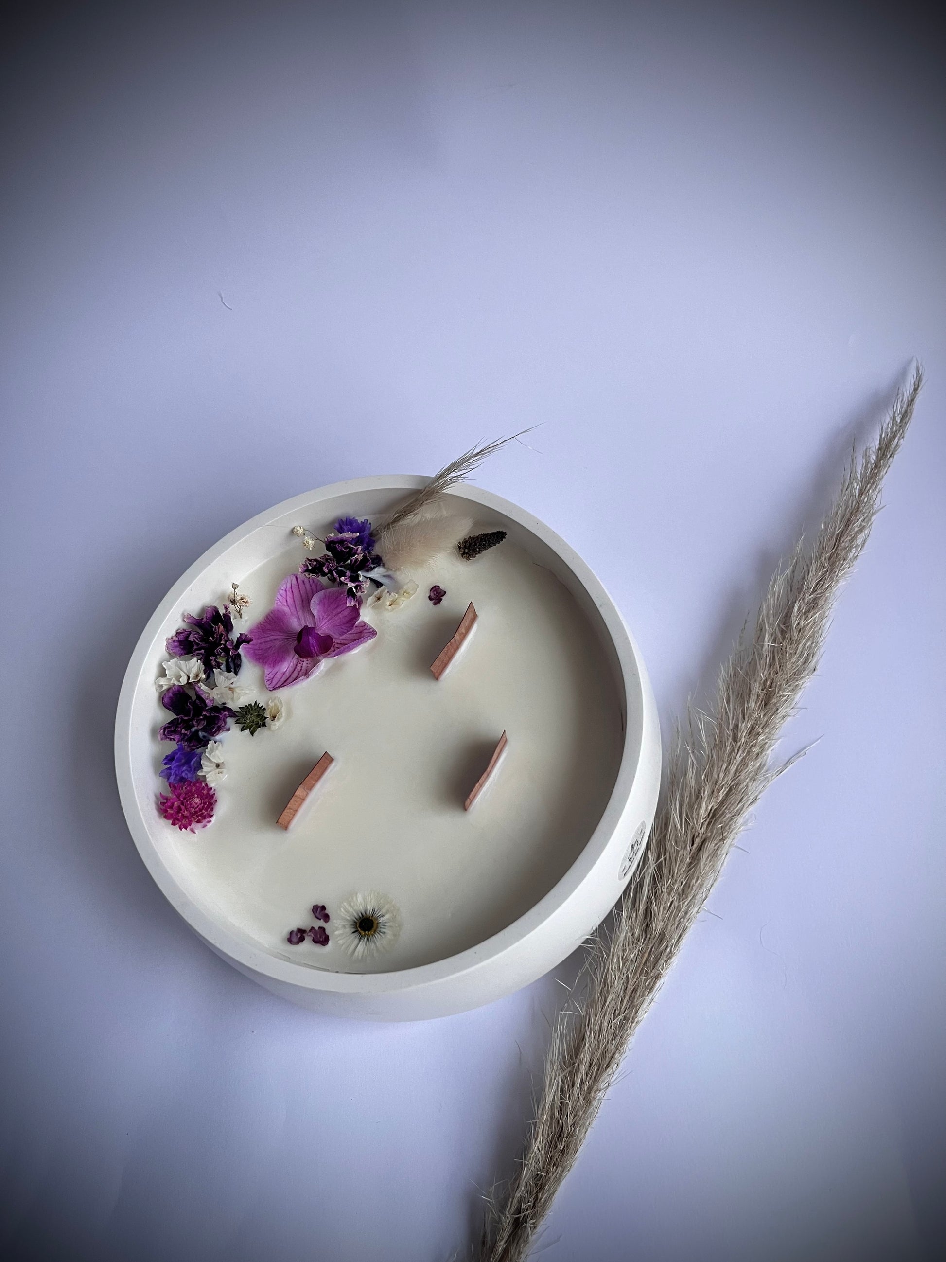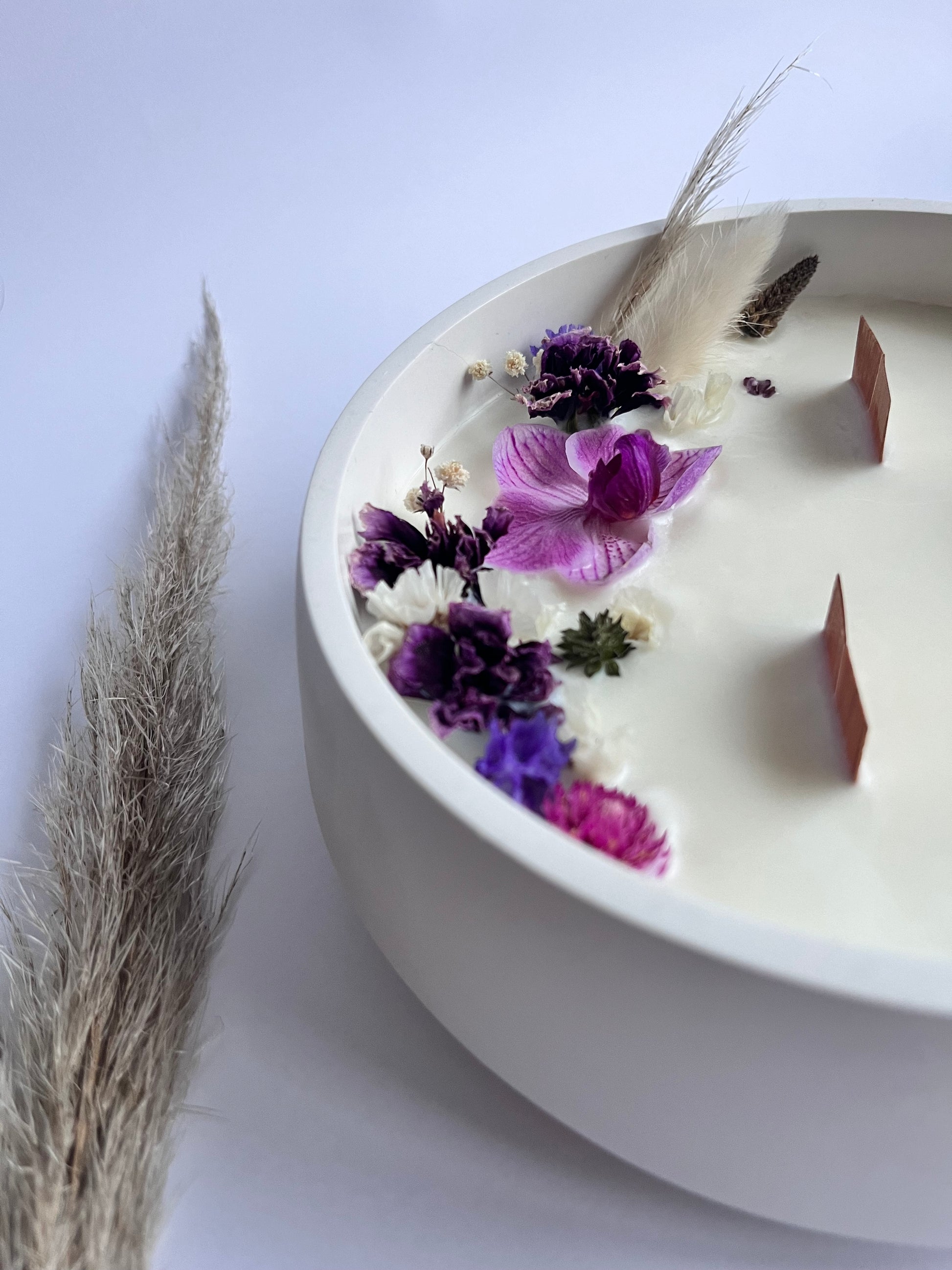 Vela perfumada feita à mão, com 100% cera de soja, decorada com flores secas. A protagonista do design floral é a orquídea — símbolo de beleza exótica e delicadeza.